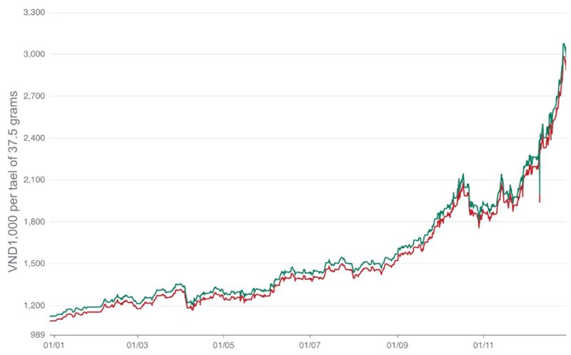 Цена продажи ювелирной сети Phu Quy выросла на 6% с воскресенья до 3,07 миллиона донгов (117 долларов США) за таэль весом 37,5 грамма. В этом году этот показатель вырос на 169%.