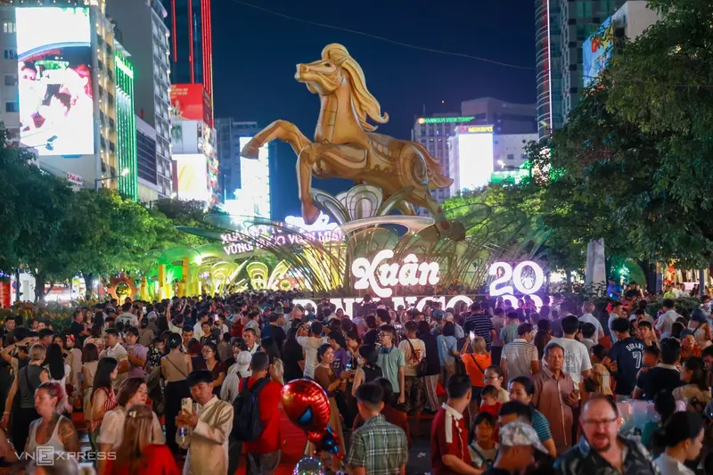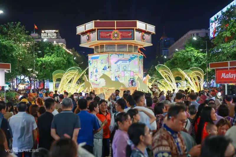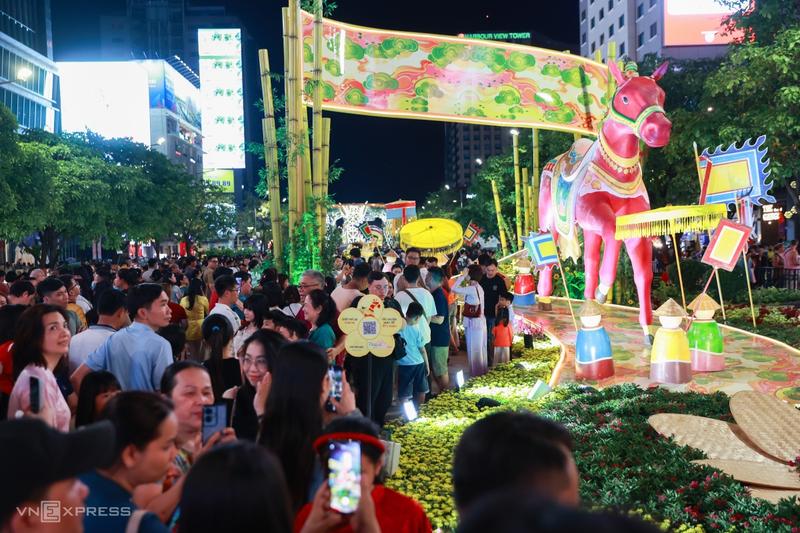 В 8 часов вечера. 15 февраля, после полумесяца строительства, официально открылась Цветочная улица Нгуен Хюэ. У главных ворот перед штаб-квартирой Народного комитета Хошимина собралась толпа, чтобы полюбоваться и сфотографировать главного талисмана лошади, высота которого составляет около 11 метров, включая основание.