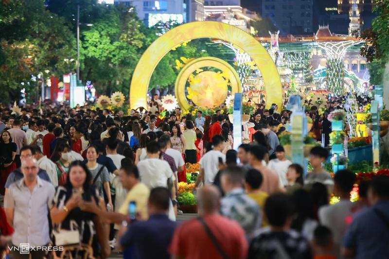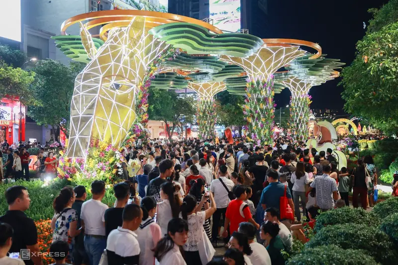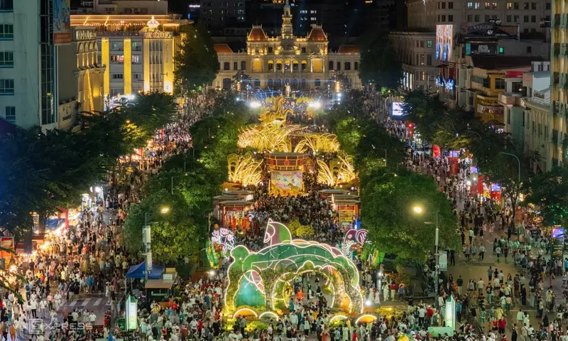 Десятки тысяч жителей и гостей города заполонили Цветочную улицу Нгуен Хюэ в воскресенье вечером, превратив сердце Хошимина в море огней, цветов и телефонных камер, когда ежегодная выставка Тэт официально открылась для публики.