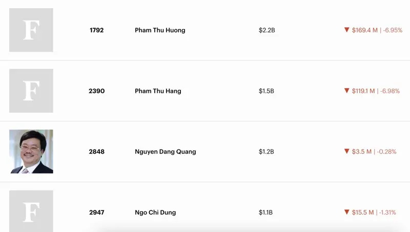 Согласно рейтингу миллиардеров Forbes в режиме реального времени, во Вьетнаме есть еще три человека, чьи активы превышают 1 миллиард долларов США, а именно г-жа Фам Тху Хыонг, г-жа Фам Туи Ханг и г-н Нго Чи Зунг.